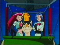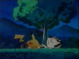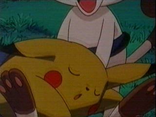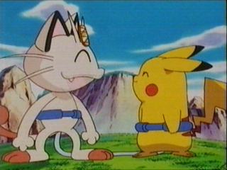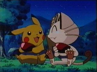 Sorry, but this is cute as hell. Meowth loves Pikachu so much he invites him to join Team Rocket, but sadly Pikas fallen asleep (in Mewoths lap. Yahah!) and misses the, er, proposal. While we're at it, who's idea was the harness? And why was it on Meowth instead of the nearest immobile object? could this have been a plan for quiet time with Pika all along? I bet he paid the pidgeot to muck up the plan and nick off with them, the saucy little minx. |